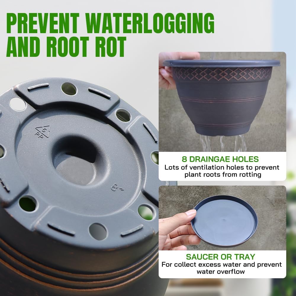 10 Inch 4 Pack Large Plant Pots, Plastic Flower Pot for Indoor & Outdoor with Drainage Holes & Saucer, Plaid Pattern Planters Garden Pots for Herbs