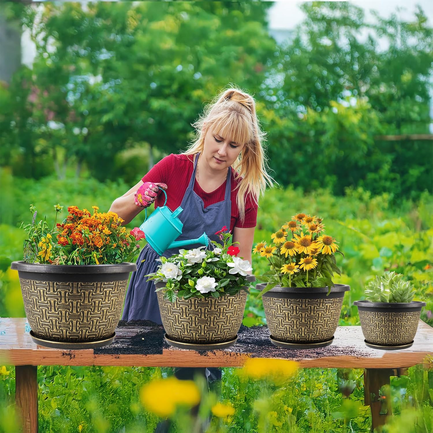 10 Inch Plant Pots, 4 Pack Flower Pots Outdoor with Drainage Holes & Trays, Retro Antique Imitation Decorative Garden Plastic Pots for Plants Indoor Sets for Houseplants