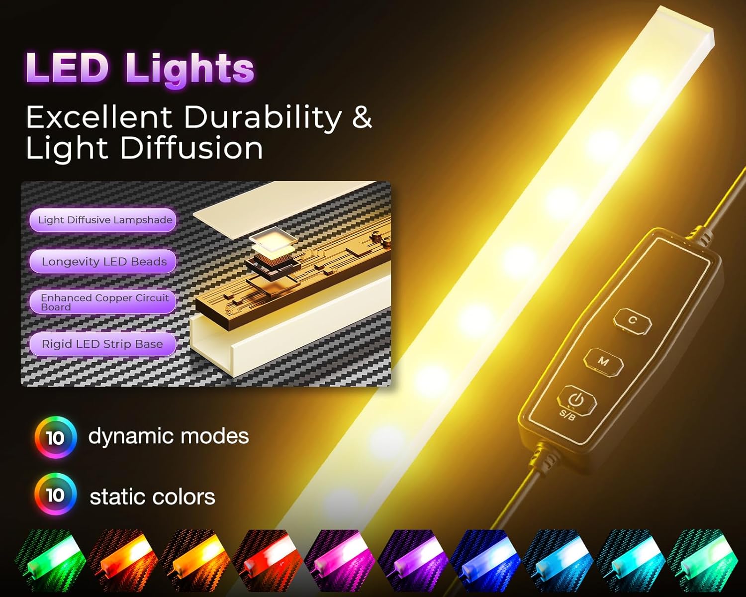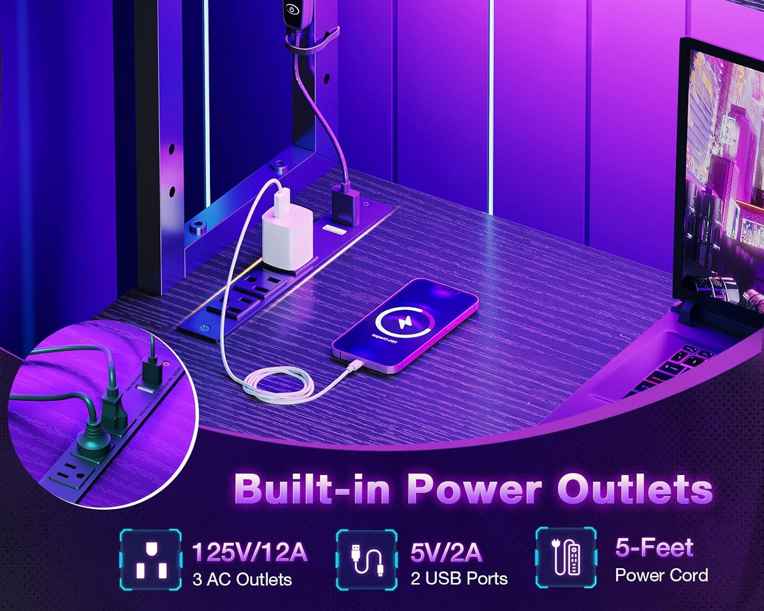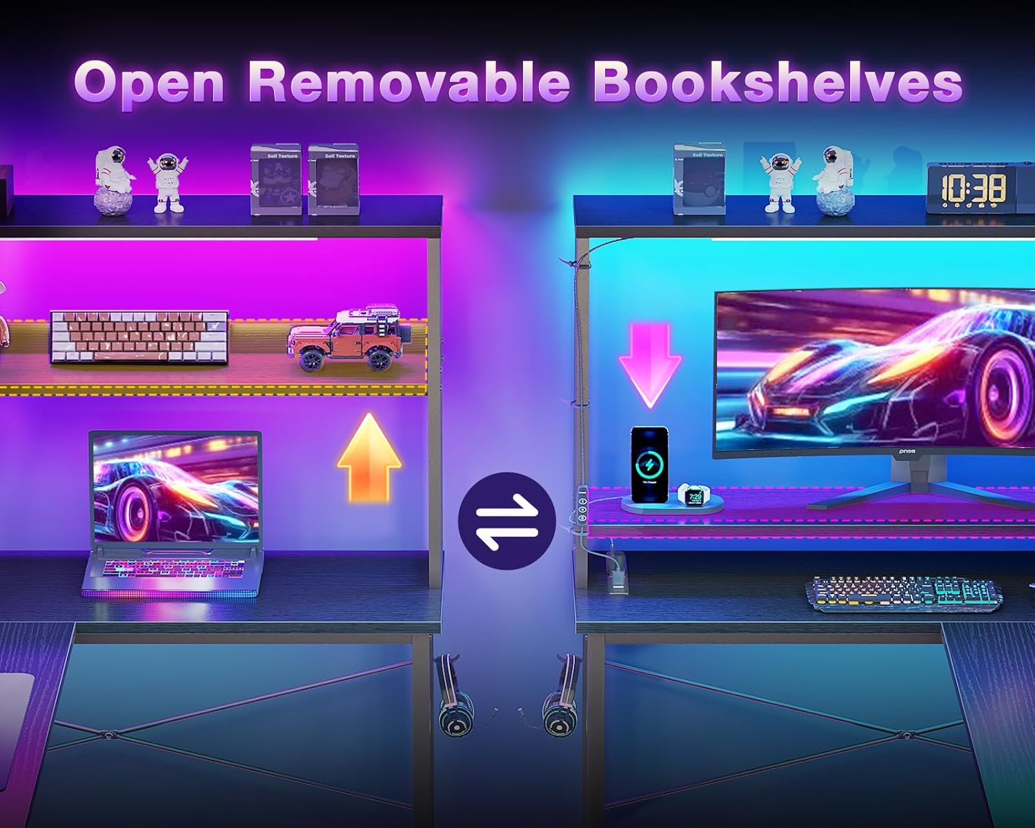 ODK 53 Inch L Shaped Desk with LED Lighting, Reversible Gaming Desk with Power Outlets, Cornor Computer Table with Storage Shelves & Bag & Iron Hook, Home Office Table for Writing, Study, Black