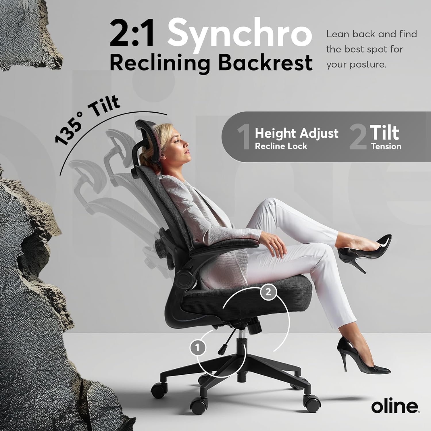Oline ErgoAir Ergonomic Office Chair – Adjustable Lumbar Support, Flip-Up Armrests, Mesh Computer Desk Chair, Swivel Rolling Executive Gaming Chair for Home & Office (Black)